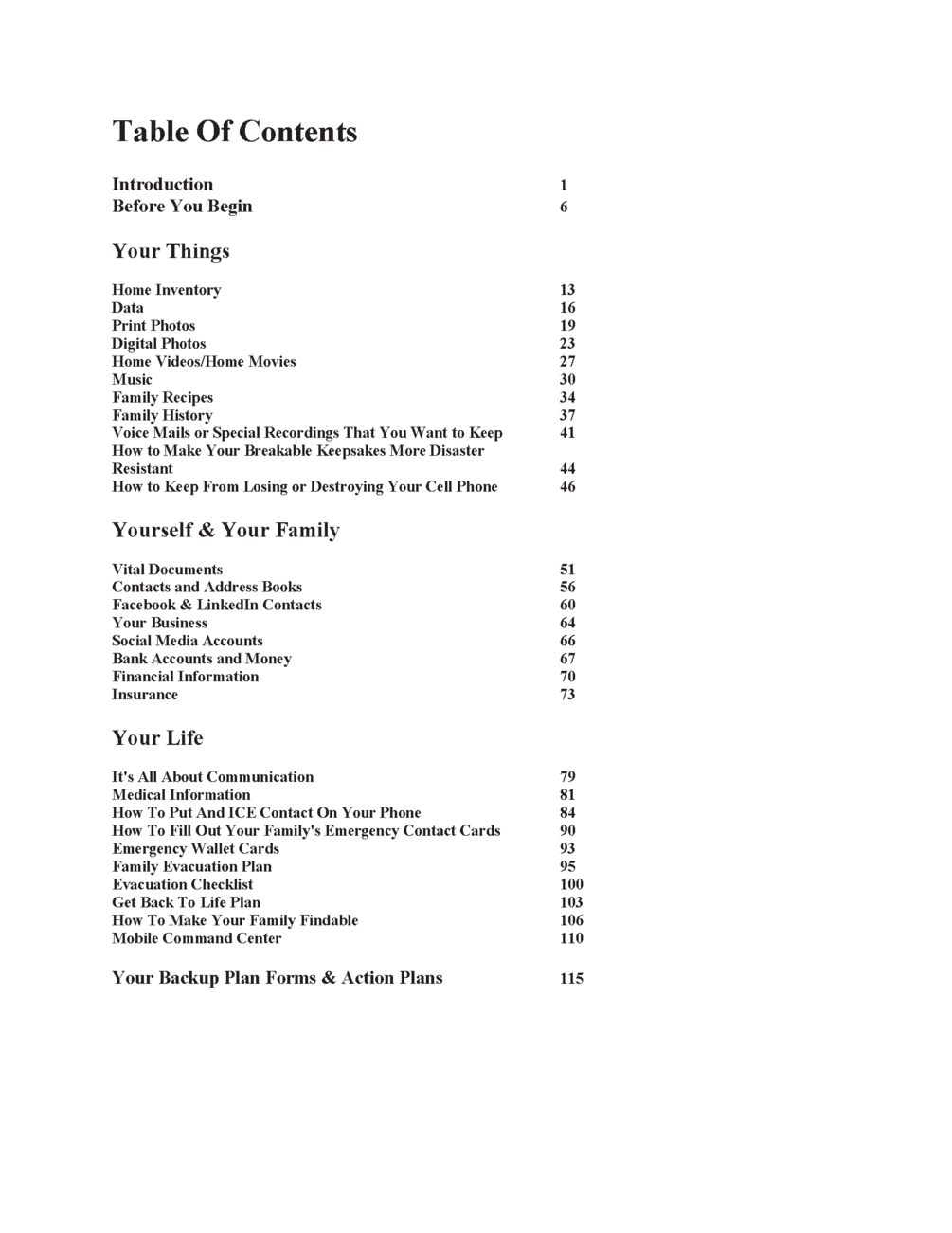 Inside the book, you'll also find downloadable Grab It & Go Forms and Action Plans, that you can complete and print or save to your computer, so you'll be ready to deal with emergencies small (a broken arm) or large (Hurricanes and Wildfires).